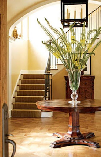 Placing a solitary legged table in the entrance of a home allows for passage around it, but also for a grand arrangement to be placed on top.